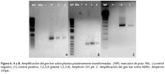 Los explantes produjeron regenerantes en la cuarta semana. De los experimentos de transformación se obtuvieron cuatro plántulas en medios de selección con el herbicida, que se evaluaron para la presencia del transgén. Las pruebas de PCR mostraron la presencia del amplicón de 531 pb predicho para el gen bar (figura 6A y 6B carriles 1, 2, 3, 4) en todas las plántulas tolerantes a PPT, mientras que en la planta control no transformada no se presentó el amplicón específico. Se realizó una prueba de RT-PCR sobre una plántula positiva para PCR, con su control correspondiente. Para ello se realizó una PCR sobre el ADNc obtenido a partir del ARN aislado. La figura 7C, muestra que se obtuvo la banda de 531 pb esperada (carril 1), en tanto que para el control negativo (ADNc de planta no transformada) no hubo amplificación. De esta manera se demostró tanto la presencia, como la expresión del transgén en las plántulas transformadas.
