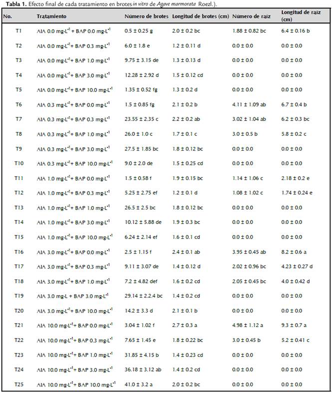 Tabla 1 Efecto final de cada tratamiento en brotes in vitro de Agave marmorata R