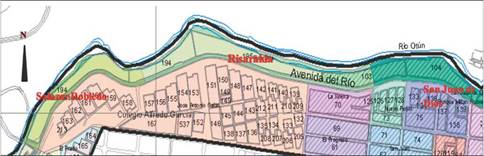 En relación con la ciudad7, como espacio urbano definido en el POT de 2000 (Acuerdo 18 de 2000): Los asentamientos analizados (barrios Risaralda, San Juan de Dios y Salazar Robledo) se ubican sobre el borde norte que representa el río Otún para el perímetro urbano de la ciudad y sobre, la frontera infranqueable de pendientes entre 50° y 100° de inclinación, que genera un gran "Telón Verde" (CARDER, 2010), perpendicular al curso del río (Figura 2). Esta localización con respecto a la ciudad, permite ubicar el lugar que ocupan los asentamientos de estudio como borde al interior del perímetro urbano, y como asentamientos de ocupación de suelos de protección ambiental municipal, dada la proximidad que se establece del asentamiento con el río y de la política ambiental que para el municipio se establece a partir de la implementación del POT de 2000 y su posterior revisión en 2006 (Artículo 40, Acuerdo 23, 2006). Igualmente permite ubicar la zona en proximidad al Clúster centro (Acuerdo 65, 2009), definiendo con ello dinámicas de territorialidad a partir de contextos socioeconómicos (ver interacción entre las Comuna Río y Comuna Centro (Figura 3).