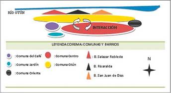 En cuanto Comuna Otún8: Esta delimitación permite comprender diferentes dinámicas alrededor de los tres barrios que son objeto de investigación: en primer lugar la condición limítrofe de la Comuna Otún con la Comuna Centro que define dinámicas de tipo socioeconómico al ser esta última la centralidad de mayor importancia en la ciudad (Acuerdo 65, 2009). De esta forma las actividades económicas (formales o informales) y sociales de los pobladores que residen sobre estos asentamientos estarán ligadas en gran medida a esta centralidad, factor que se convierte en determinante a la hora de analizar los arraigos territoriales.
