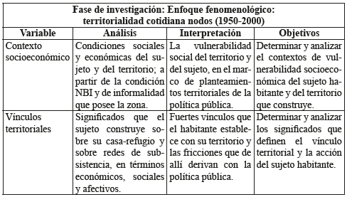 Ya para la segunda etapa, se consolidaron variables de trabajo: definidas por el contexto socioeconómico del territorio (con sus respectivos indicadores: NBI13 e informalidad territorial14), y los vínculos territoriales (con los indicadores: casa-refugio y redes de subsistencia). Sobre esta base, inicia el análisis-interpretación a la territorialidad del sujeto habitante en las orillas del río (Ver Tabla 1); para ello se tomó la entrevista etnográfica, desde el desarrollo de un amplio margen de estas (15 en total), en las que predomina el relato, la narrativa, la vivencia, los significados que posee el habitante sobre su territorio, sobre el área de estudio y sobre las dinámicas que se manifiestan; se plantearon revisiones sobre documentos, que coadyuvaron a situar el territorio en términos de producción social de agentes hegemónicos que lo producen y de conflictos a los que tiene lugar el encuentro con otras territorialidades15; finalmente se implementó la técnica de observación participante desde la cual se logra acercar "elementos invariables y constantes (…) eventuales o novedosos" (Quintana-Peña, 2006, p. 68) sobre la dinámica del espacio.