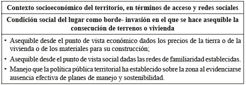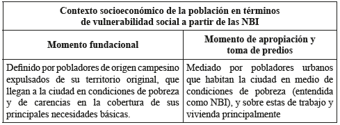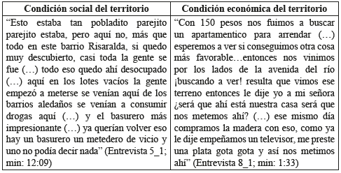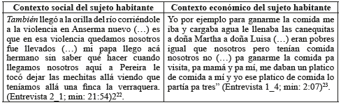 En cuanto contexto socio-territorial del poblador, los relatos permitieron delimitar dos condiciones de su habitar. Por un lado, la vinculación a procesos de migración por violencia [principalmente al noroccidente del Departamento, y en este los municipios de Quinchía y Anserma viejo (Chacón, 2004)]. Por otro, la insatisfacción de necesidades básicas de subsistencia NBI (incluida la vivienda):