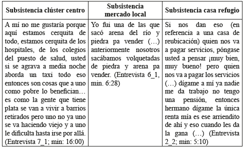 La fenomenología planteada, permitió igualmente visualizar vectores de comportamiento que definen esta variable. De esta forma, las redes de subsistencia han creado estrechos vínculos al territorio que conforman los asentamientos de las orillas del río, en tres sentidos: dada la interacción locacional que esta permite con respecto al clúster Centro (Comuna Centro); dada la búsqueda de fuentes de ingreso en el mercado que se moviliza sobre el mismo lugar; y dada la adquisición de la misma casa-refugio que constituye fuente de ingresos:
