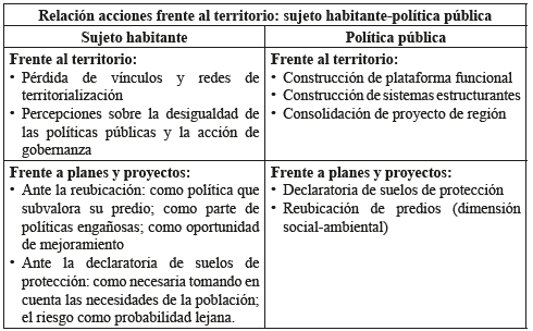 De este modo a partir de los resultados obtenidos durante la fase fenomenológica, se definen tensiones y conflictos, derivados de la implementación de programas y proyectos de gestión y planificación territorial, sobre la territorialidad del sujeto habitante; lo que permitió plantear interrogantes sobre el mundo de la vida (reflexión) desde los significados desiguales-asimétricos que de este mundo fueron observados (crítica), y desde el posicionamiento de otros discursos y otros paradigmas de la política territorial, que se sintetizan en la propuesta de desarrollo sostenible territorializado de Gutiérrez (2012). Así el sujeto que habita las orillas del río históricamente (proveniente del nodo fundacional) se ve sometido a la fricción que le impone el programa de reubicación y la declaratoria de suelos de protección al sostener vínculos, que desde su percepción y criterio, no son tomados en cuenta por los planificadores; igualmente el sujeto que toma y apropia predios del municipio (segundo nodo), es friccionado por la inminencia del desalojo, al ser considerado "invasor" por entidades públicas como control físico (de la secretaría de gobierno municipal) y por los conflictos socioeconómicos que se profundizan desde la NBI. (Ver Tabla 2. Relación sujeto-política pública).