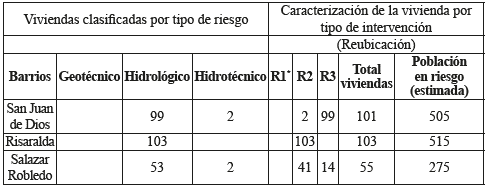 Frente a la población tomada, los barrios Risaralda, San Juan de Dios y Salazar Robledo, tenían según información de planeación municipal (CARDER, 1998) para 1997 un total de 259 viviendas evaluadas bajo condición de riesgo hidrológico e hidrotécnico16, siendo propuestas para su reubicación la totalidad de las mismas (Ver tabla 4). Para 2010, la Secretaría de planeación municipal a través del "diagnóstico a la unidad de planificación 7" (SPM, 2010), determina un total de 277 predios en la zona (Ver Tabla 5), 18 predios más en un margen de 13 años, con respecto a los datos presentados por CARDER.