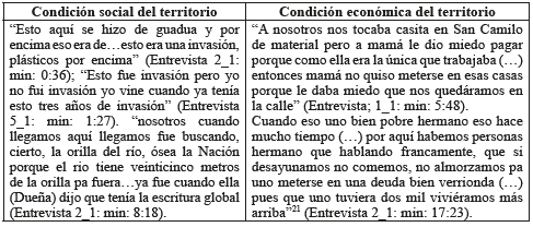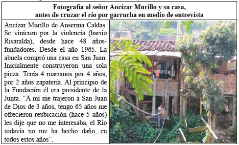 Como preámbulo a la exploración de los contextos socioterritoriales que transversalizan al sujeto; la narrativa permitió visualizar aspectos físicos del territorio17 sobre los cuales se define interactivamente la identidad social y económica: de esta manera la zona hacia la década de los cincuenta, hacía parte del sistema de inundación del río Otún18 (entre las actuales calles 19 y 38), configurándose como un lacustre, poco accesible, sobre el cañón del río Otún, en el que predominaban lagunas, quebradas y malezas: así lo describen los relatos19, "toda la 35 era rastrojos, no habían estas casas de ahí de la segunda (...) todo era en rastrojo, puro monte (...) todo lo que es Galán eran lagunas hasta la 31 con segunda" (Entrevista min: 4:33); igualmente (la entrevistada) recuerda como, "lavábamos al frente en unos charcos porque como todo eso era lagunas al frente antes de hacer a Galán (…) esos charcos empezaban desde la segunda (…) hasta abajo hasta la orilla del río (…) eso todo eran rastrojos" (Entrevista 1_3; min: 0:05). Bajo esta condición física, proveniente de la memoria remota de los pobladores que desde el momento de fundación han ocupado estas orillas, se empezó a configurar un territorio, que en términos sociales, terminará constituyéndose como asentamiento informal en el marco de procesos invasivos y barrios autoconstruidos sobre las orillas del río; en términos económicos un territorio que brinda condiciones de asequibilidad al sujeto dado el valor de la tierra y de la vivienda (Tabla 6. Síntesis de relatos):