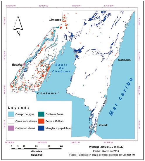 Estos resultados no son sorprendentes, ya que las zonas urbanas (Figura 2) están rodeadas de campos de cultivos, lo que significa que cualquier expansión espacial en la zona ocurre a expensas de Campo agrícola; como se observó, alrededor de principales asentamientos urbanos como Chetumal, la capital de la Quintana Roo, Majahual-Xcalak y Bacalar. Dicha sustitución de las tierras agrícolas es muy bien conocida en todo el mundo, en general, y en la península de Yucatán, en particular (Velásquez, 2007). Las altas magnitudes de cambios sistemáticas en ambos períodos de estudio se deben a factores socio-económicos y políticos que favorecen desarrollo de turismo.
