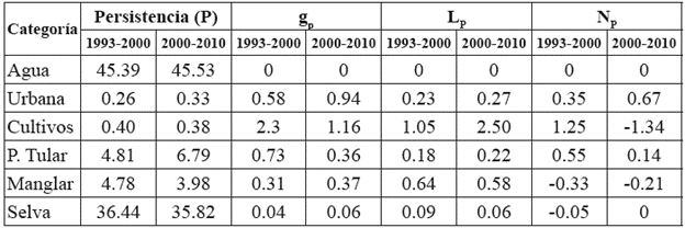 La persistencia en la vegetación natural, fue mucho mayor que en otras clases, en ambos períodos de estudio. Las categorías Agua y Selva, presentaron los mayores (>35%) y menores valores (~0) de los índices P y de g p , respectivamente, durante período 1993-2010. La categoría cultivos, fue la única cobertura que registró valores de g p >0, en los dos períodos de estudio. Asimismo, se observó un patrón similar para el índice L p , en el que Cultivo fue la única categoría con L p >1. Nuevamente, siguiendo a Braimoh (2006), las categorías con la relación L p >1 indican una mayor tendencia a cambiar a otras clases que a persistir. En contraste, solo la categoría manglar presentó valores negativos de Np (-0,33 y -0,21) en ambos períodos de tiempo, respectivamente. Mientras que la relación N p de la categoría selva, fue negativa (-0,05), en el período 1993-2000, y cero de 2000-2010. Las relaciones N p para el resto de las clases, fueron positivas en ambos periodos de estudio, exceptuando cultivo, el cual registró un valor negativo (-1,34) en el período 2000-2010.