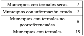 En la tabla anterior se muestra los 19 municipios encontrados con fuentes termales. Se clasifica este recurso desde 2 variables: fuentes termales que presentan una alta concentración de sulfato, halladas en 6 municipios, y termales con otra composición mineral, en 13 municipios.