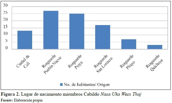 Como se muestra en la Figura 2, la mayoría de indígenas encuestados son nacidos en resguardos del departamento del Cauca. Alrededor de 13 personas nacidas en la ciudad de Cali corresponden a niños nacidos durante los años de conformación del cabildo. Los anteriores datos pueden ser consecuentes con el hecho de que cada territorio se constituye por sí mismo como un punto geográfico para la confluencia de diversas personas, que quieren tomarlo como asentamiento permanente o transitorio, dependiendo de la actividad que deseen desarrollar. Asimismo, como fue expresado por los líderes del cabildo, sus jurisdicciones son espacios abiertos para todos aquellos que deseen habitarlos, sin distingo de procedencia, raza y credo, esto se debe a que consideran que se es indígena por el vivir en un territorio colectivo, y por tanto ningún lugar debe ser vedado para la ubicación y residencia de cualquier familia o persona.