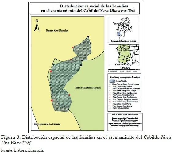Como se observa en la Figura 3, la estructura de localización está en función de las redes familiares y recomendaciones del The Wala (quien realiza una ceremonia para que la naturaleza indique el lugar predilecto). Esta afirmación deriva también de las condiciones que señalan las familias para la localización de las viviendas de los hijos y los vecinos: "[c]erca pero no allado, a la distancia que está ahora, cerca pero no enfrente, cerca de la mía" (Osnas, 2013), como una necesidad de definir su territorialidad. Esto es el resultado de una migración producida por redes familiares, influenciada a su vez por el desplazamiento forzado producto de olas de violencia en el departamento del Cauca, y por falta de oportunidades educativas y de trabajo. Se considera a las redes familiares como un elemento explicativo del crecimiento de los flujos migratorios, de los comuneros Nasa al asentamiento de estudio, desde hace cuatro años hasta la fecha presente. Las redes familiares cumplen diversas funciones tanto en el resguardo de origen como en el asentamiento, las mismas que facilitarían en muchos casos la puesta en marcha del proyecto migratorio. Este hecho ayuda a explicar el incremento de los flujos migratorios hacia la ciudad de Cali.