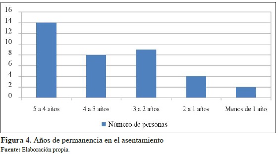 Alrededor del 50% de las familias encuestadas presentan un tiempo de permanencia en el asentamiento entre cinco y cuatro años. Las proporciones así referidas dan cuenta que el arraigo en el actual lugar de asentamiento es una conquista territorial al lograr mantener cierto grado de estabilidad poblacional entre sus habitantes. No obstante, las situaciones adversas que contravienen las familias, como el hostigamiento frecuente de la Secretaría de Vivienda, atentan sobre la dignidad de las personas.
