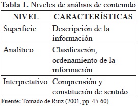 El análisis de contenido (AC) establece un vínculo entre tres niveles del lenguaje: el nivel de superficie, el nivel analítico y el nivel interpretativo, tal y como se explica en la Tabla 1.