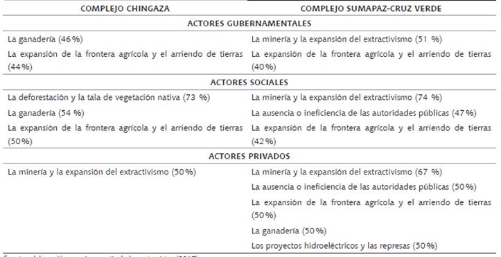 Según el tipo de actores, en las muestras de ambos complejos predominan los gubernamentales (alcaldías, concejos, personerías y corporaciones autónomas, entre otros) con un 63 % en Chingaza y un 48 % en Sumapaz-Cruz Verde. En el segundo lugar se encuentran las organizaciones sociales (organizaciones locales y regionales, organizaciones no gubernamentales y asociaciones comunitarias de servicios públicos, entre otros), con un 32 % en Chingaza y un 46 % en Sumpapaz-Cruz Verde. En tercer lugar están las organizaciones privadas vinculadas con el sector productivo: 5 % en Chingaza y 6 % en Sumapaz.