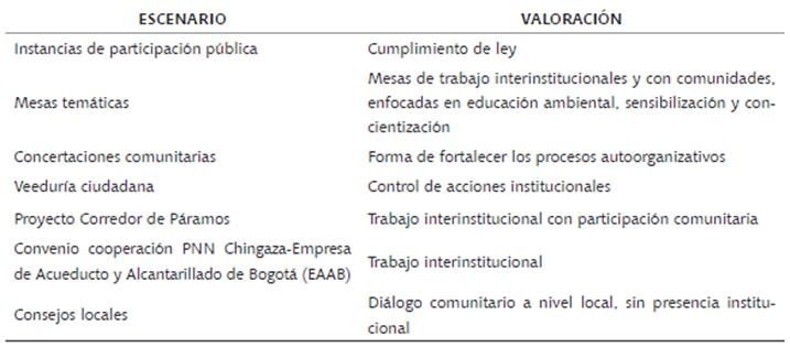 TABLA 2 ESCENARIOS DE DIÁLOGO Y PARTICIPACIÓN EN EL COMPLEJO DEL PÁRAMO DE CHINGAZA