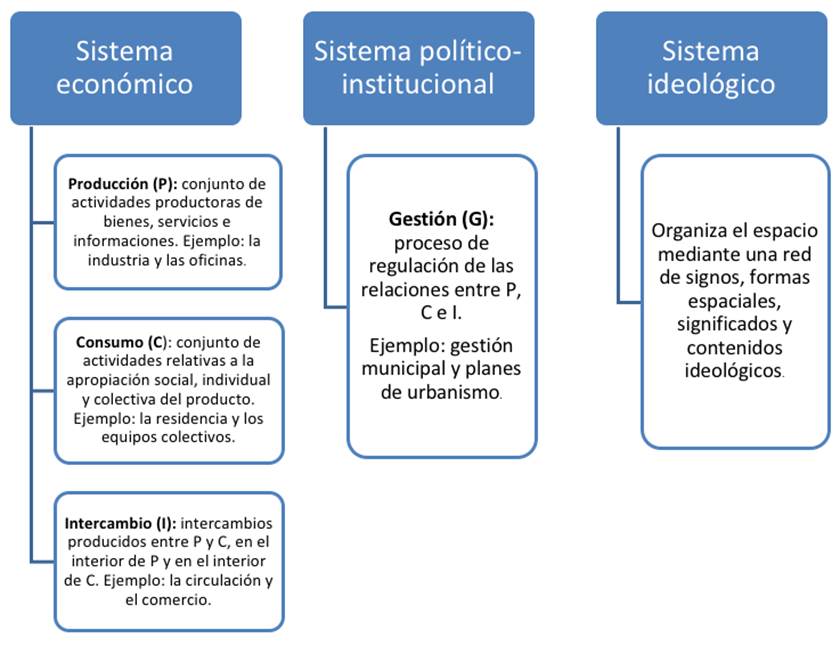 En este planteamiento, la estructura social se define por el modo de producción que prevalece en una formación social específica, cuyas instancias son: lo económico, lo político-institucional y lo ideológico. En el modo de producción capitalista la instancia económica cumple un rol determinante y central. De esta manera, el espacio urbano deviene expresión de la estructura social (Castells, 1974, p. 154). A partir de ello, en la estructura espacial urbana se distinguen tres dimensiones de análisis independientes, pero que interactúan entre sí (Figura 1).