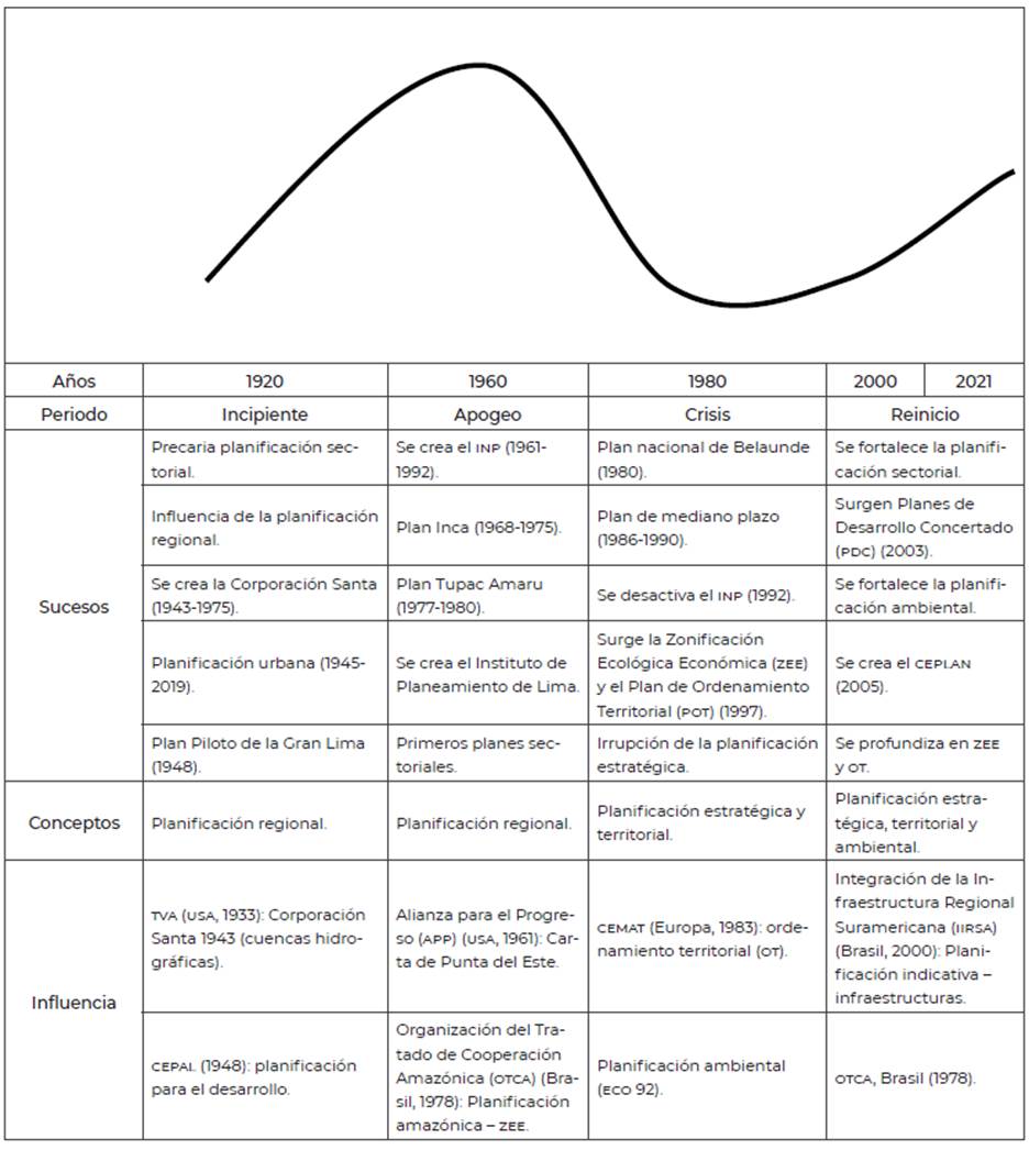 Esta periodización permite comprender en una perspectiva temporal la evolución de la planificación, desde la regional que surgió en la década de los treinta del siglo pasado hasta lo territorial y ambiental que rigen en la actualidad. En el primer periodo, denominado "incipiente", destaca el empleo de metodologías poco sofisticadas para la planificación sectorial y la planificación regional a través de cuencas hidrográficas. En el segundo periodo, denominado "apogeo", se realizó una intensa labor de planificación regional a partir de la creación del Instituto Nacional de Planificación (INP), entidad que tuvo un importante papel en la historia contemporánea del país, al mismo que tiempo que se formularon planes sectoriales con criterios y técnicas más rigurosos. El tercer periodo, denominado "de crisis", guarda relación con la desactivación del INP y el abandono de las experiencias acumuladas en el proceso. Finalmente, el cuarto periodo, designado como "reinicio", está marcado por el surgimiento de nuevos tipos de planificación, entre las que destacan la ambiental, la estratégica y la sectorial, bajo la rectoría del CEPLAN.