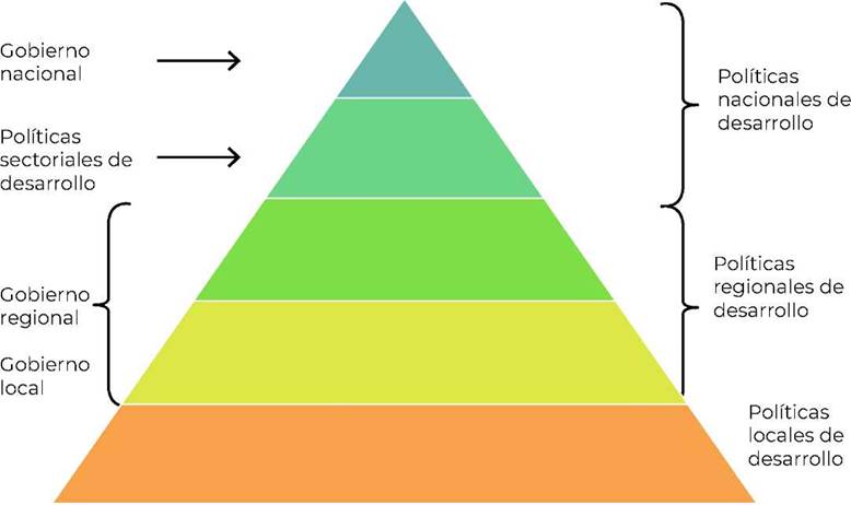 El SINAPLAN se caracteriza por ser un conjunto articulado e integrado de órganos, subsistemas y relaciones funcionales estatales cuya finalidad es la coordinación y la viabilización del proceso de planeamiento estratégico nacional, con el objetivo de promover y orientar el desarrollo armónico y sostenible del país, todo lo cual está moldeado por el contexto social (Servillo & Van Den Broeck, 2012). El sistema está conformado por el Poder Ejecutivo, integrado por los ministerios, el Poder Legislativo, el Poder Judicial, organismos constitucionales autónomos (OCA), los gobiernos subnacionales (regionales y locales) y el Foro de Acuerdo Nacional, integrado por partidos políticos y organizaciones de la sociedad civil. Asimismo, como se observa en la Figura 2, en Perú los niveles de planeamiento estratégico están articulados en forma jerárquica.