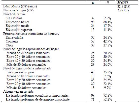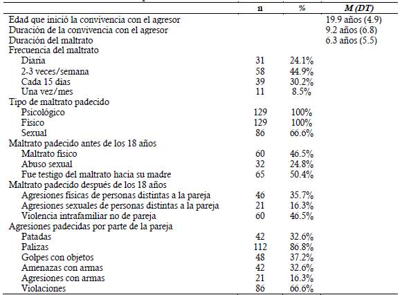 Como se observa en la Tabla 1, la media de edad de la muestra era de 31.7 años. Tenían dos hijos de media. En cuanto al nivel educativo, la mayoría tenía educación básica. Por otra parte, respecto a la situación económica, el principal aportador de ingresos al hogar era el agresor y más de una de cada tres entrevistadas no contaba con ingresos propios. La mayoría de las participantes disponía de bajos recursos económicos y más de la mitad había tenido problemas de desempleo a lo largo de su vida.