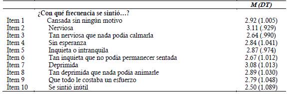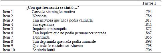 También se empleó la EscalaKessler (K-10) (Kessler, Andrews, Cople & Hiripi, 1992), que consta de diez preguntas específicas sobre el malestar psicológico referidas a la ansiedad y la depresión. Las opciones de respuestas son de tipo Likert, categorizadas en una escala ordinal de cinco niveles (5, siempre; 4, casi siempre; 3, a veces; 2, casi nunca y 1, nunca). La suma de las puntuaciones tiene un mínimo de 10 y un máximo de 50. Los rangos del instrumento presentan cuatro niveles: bajo (10-15), moderado (16-21), alto (22-29) y muy alto (30-50). A partir de una muestra de 280 participantes de México, el Alfa de Cronbach hallado en la validación del instrumento por Terrez, Villamil, Rodríguez, Pérez & Cortés (2011) fue de .901. El Alfa de Cronbach obtenido en el presente estudio ha sido α = .947.