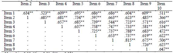 También se aprecia correlación entre los distintos ítems del K-10, donde se encuentra significatividad en todas las variables del instrumento (véase Tabla 7).