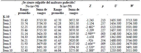 Finalmente, se muestran las puntuaciones obtenidas en los ítems 3, 5, 8, 9 y 10 del K-10, donde se hallaron diferencias estadísticamente significativas entre quienes se sintieron culpables por el maltrato padecido y quienes no se sintieron culpables (Tabla 8). Igualmente, se hallaron diferencias estadísticamente significativas entre quienes albergaban sentimientos de culpa por el maltrato padecido en función de los rangos establecidos en la escala K-10 (bajo [10-15], el 5%; moderado [16-21], el 19%; alto [22-29], el 25.6%; muy alto [30-50], el 50.4%) (X 2 = 13.939; p = .000).