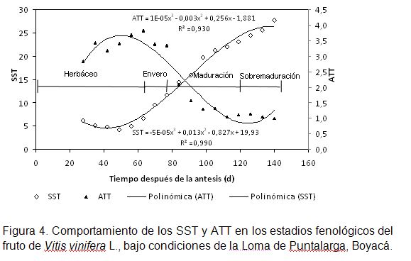 Así mismo, la biosíntesis de ácidos orgánicos, como el tartárico y el málico, es representativa y constante en el periodo herbáceo, por tanto, el contenido de SST en las bayas es bajo, mientras que el contenido de ácidos es elevado (Figura 4); esto concuerda con Reynier (1995), quien además sostiene que estos compuestos difieren según la época del año y de las variedades.
