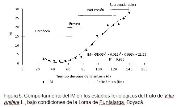 Por su parte, el pH se caracterizó por un marcado incremento al pasar de 2,35 a 3,22 (Figura 3); similar fue el comportamiento de los SST que alcanzó 23,07°Brix (Figura 4) y el IM incrementó hasta 20 (Figura 5), mientras que la ATT decreció pasando de 3,34 a 1,11 (Figura 4). Mullins et al. (2000) y Reynier ( 1 995) reportan, además de los cambios mencionados para la maduración, la acumulación de minerales, formación de polifenoles, síntesis y acumulación de sustancias aromáticas, cambio en el color, ablandamiento de la baya y aumento de tamaño, el cual, está directamente relacionado con el incremento en la elongación celular y no en la división de células (Salisbury & Ross, 1994).