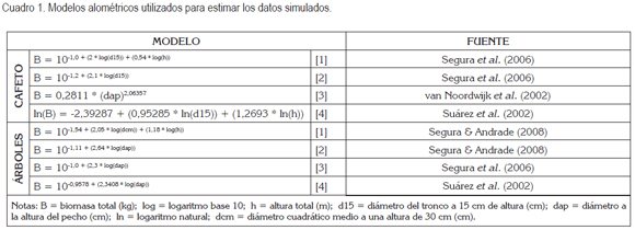 También, se han implementado modelos de alométricos de biomasa para Coffea arabica L., en Nicaragua (Segura et al. 2006; Suárez et al. 2002) e Indonesia (van Noordwijk et al. 2002).