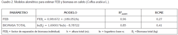 2. Determinación de factores de expansión de biomasa (FEB): se efectuó por inferencia lógica basada en ecuaciones alométricas elaboradas por otras investigaciones, a través de mediciones directas en campo. Tanto para los árboles de sombrío como para los cafetos, se emplearon cuatro ecuaciones alométricas, reportadas por Segura &Andrade (2008), Segura et al. (2006), Suárez et al. (2002) y van Noordwijk et al. (2002). Con cada uno de ellos, se calculó la biomasa total, de acuerdo a la variable independiente utilizada (diámetro o altura), cuyos resultados fueron sumados y promediados para obtener un valor simulado de biomasa total (cuadro 1). Este resultado fue dividido por el valor real de biomasa seca del fuste (tallo, en el caso de los cafetos), obtenido en la presente investigación y, finalmente, se obtuvo un FEB individual. El resultado fue correlacionado con la variable altura total (h), para los cafetos y DAP, para los árboles.
