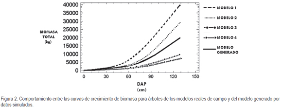 Con base en el modelo, se puede establecer que un árbol con DAP promedio de 40cm puede presentar una cantidad de biomasa seca, de aproximadamente 1,13t, resultado que guarda semejanza al emplear el mismo diámetro con el segundo modelo propuesto por Segura &Andrade (2008); aunque también hay que advertir que dicho resultado es mucho mayor que el arrojado por los modelos tres y cuatro para este mismo valor diamétrico, lo cual, resulta perfectamente justificable, si se tiene en cuenta que más del 50% de los árboles de la muestra presentaron valores de biomasa fustal, que superaron el valor de biomasa total pronosticado por dichas ecuaciones, para un diámetro determinado (figura 2).