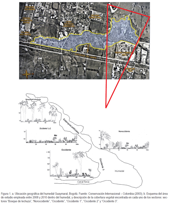 El humedal Guaymaral, con una extensión de 43ha, se encuentra ubicado al nororiente del casco urbano de Bogotá (Figura 1a), a 2550m de altitud presentando un clima frío distribuido en un piso bioclimático altitudinal subandino o andino bajo (Matallana et al. 2004). La pérdida de los principales afluentes tales como el canal Torca y la Quebrada El Guaco, han modificado el régimen hídrico del humedal, por lo cual el espejo de agua se presenta de manera más o menos permanente, dependiendo su extensión de los periodos de lluvia (Osbahr &Gómez, 2006). En el extremo occidental del humedal se forman estanques artificiales que en época invernal mantienen volúmenes importantes de agua (CIC, 2003). El humedal se encuentra rodeado de pastizales ubicados en zonas de relleno y destinados a la producción pecuaria, especialmente de ganado bovino y equino. El área de estudio presenta un mosaico de vegetación introducida no plantada y de crecimiento espontaneo, que ocupa tanto las zonas de ronda como los sectores inundables; áreas reforestadas con especies nativas e introducidas y áreas de vegetación nativa tanto terrestre como acuática. La vegetación flotante dominante es Eichornia crassipes, planta introducida que llega a cubrir grandes áreas del humedal (Osbahr &Hernández-Schmidt, 2006).