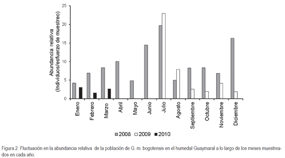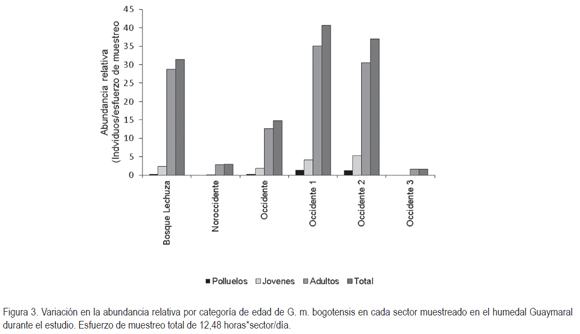 Durante todo el estudio se obtuvo un total acumulado de 1603 registros de individuos de G. m. bogotensis en diferentes estados de desarrollo (polluelos 41, jóvenes 171 y adultos 1391 registros respectivamente). Estas cifras indican que, aún cuando el humedal ha sufrido un deterioro permanente, subsiste una población con actividad reproductiva. La abundancia relativa de la población mostró variaciones a lo largo de los meses muestreados (Figura 2).