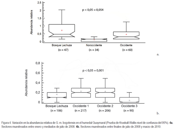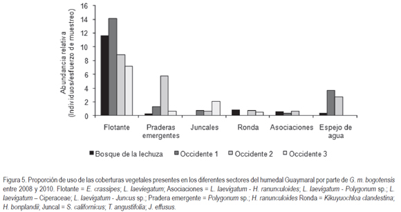 Se encontraron diferencias estadísticamente significativas al comparar las abundancias relativas de G. m. bogotensis en los diferentes sectores muestreados (Figuras 4a y b). Esta diferencia es atribuible a la presencia de comunidades vegetales que caracterizan a cada sector, por lo cual la variabilidad en la abundancia podría reflejar el uso del hábitat de manera dinámica de acuerdo a la disponibilidad de recursos (Kusch et al. 2008). Los sectores "Noroccidente", "Occidente" y "Occidente 3" se caracterizan por conservar juncales (Typha angustifolia, Schoenoplectus californicus, Cyperus rufus, Juncus effusus y Juncus sp.) asociados con Polygonum sp. y Rumex sp. y una ronda con vegetación herbácea (Cirsium sp., Oxalis corniculata, Kikuyuochloa clandestina, Hyrocotile bonplandii, Verbena litoralis, Holcus lanatus, Rumex sp., Trifolium repens, Senecio madagascarensis y Polygonum sp.) (Figura 1b). En los sectores "Occidente 1 y 2", el cinturón de juncales está compuesto únicamente por J. effusus y C. rufus. En el bosque de la lechuza la cobertura de juncales es baja y el cuerpo de agua está rodeado por plantaciones mixtas de Cipreses (Cupressus sp.), Pinos (Pinus sp.), Eucaliptos (Eucalyptus sp.) y Sauces (Salix humboldtiana) (Figura 1b). Sin embargo, mantiene condiciones apropiadas para G. m. bogotensis asociadas principalmente a la presencia de vegetación acuática (E. crassipes, H. ranunculoides, A. filiculoides). A su vez, la presencia de vegetación flotante (Eichornia crassipes y Limnobium laevigatum, Lemna gibba, Azolla filiculoides) varía constantemente en los sectores "Occidente 1 y 2" de acuerdo a las variaciones en el nivel del agua por la estacionalidad de las lluvias. Esto favorece la formación de praderas emergentes de Polygonum sp., Hydrocotile sp invadidas ocasionalmente con pasto kikuyo (K. clandestina). De tal manera que el humedal de Guaymaral le ofrece a G. m. bogotensis un mosaico de hábitats para realizar actividades de descanso, limpieza, movimiento, alimentación e interacción social. Los juncales a su vez conforman un hábitat apropiado que ofrece refugio y zonas de anidación para G. m. bogotensis (Botero-Delgadillo et al. 2006).