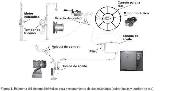 Parámetros de trabajo de las máquinas: Para una fuerza de tiro de 200kg y una velocidad de virado de las artes de pesca de 60m/min, las revoluciones del órgano de trabajo fueron de 136 RPM y el torque o par-motor en el eje de 1.219,2lbf. pulg. El gasto volumétrico de admisión: 190cm3/rev. Los diámetros internos de las mangueras calculados fueron ¾'', para las de alta y retorno y ½'', para las de alta, que van y regresan de la válvula de control al motor hidráulico.