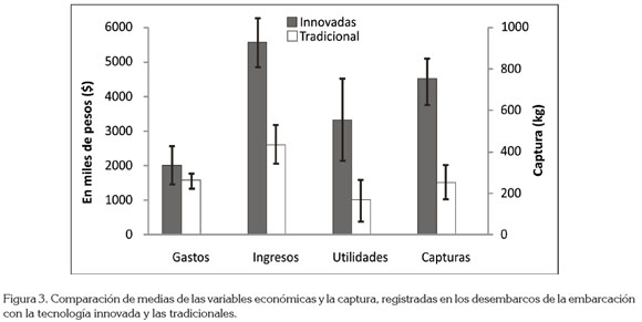 El análisis económico comparativo, se realizó con 14 registros de desembarcos, cuatro de ellos a la embarcación con innovaciones y 10 a las que operaron en forma tradicional. Los resultados de la prueba de Wilcoxon indicaron diferencias entre las medias de las tecnologías comparadas (p<0,05), excepto en los gastos operativos, que fueron similares en los dos modelos comparados. Los promedios de captura de la embarcación innovada son del orden de 787kg, en comparación con las capturas de las embarcaciones tradicionales de 280kg, para generar una utilidad promedio que alcanza el 229% más, con respecto a las que operaron manualmente (Figura 3).