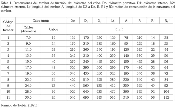 Dimensionamiento de los órganos de trabajo y cálculo del accionamiento hidráulico: El órgano de trabajo del cobralíneas está compuesto por el acoplamiento de un tambor de fricción y una polea. Las dimensiones del tambor, se determinaron en función del calibre del cabo seleccionado, utilizando la información de la tabla 1. El diámetro primitivo de la polea y el tambor son equivalentes y la garganta de la polea, se construyó con un ángulo de acuñamiento entre 40° y 45°, según recomendación de Torbán (1975).