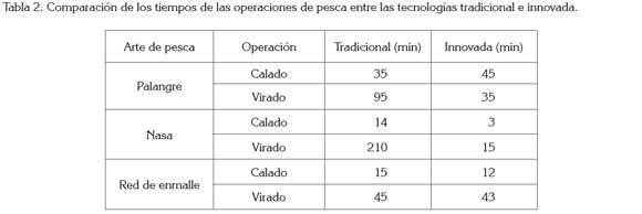 A lo anterior, se agrega la reducción del esfuerzo físico, demostrado en la disminución de los tiempos efectivos de pesca (Tabla 2). Particularmente, el caso de las nasas que, tradicionalmente son caladas por parejas a profundidades cercanas a 60m y levantadas en forma manual por tres o cuatro hombres, demorando alrededor de media hora (Zúñiga et al. 2009), mientras que con la máquina instalada, se cobraba un tren compuesto por 10 nasas, separadas 30m entre sí, en un tiempo promedio de 14 minutos. Por otro lado, en la operación del palangre, se pudo observar un mayor tiempo en la maniobra de calado, debido a que la utilización de un palangre mecanizado requiere el uso de ganchos para sujetar los bajantes a la línea madre, lo que demanda mayor tiempo, circunstancia que no se presenta en los artesanales, cuyos bajantes permanecen anudados a la línea principal.