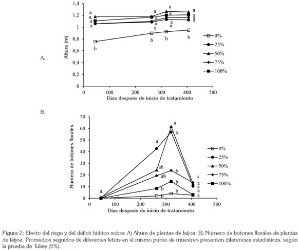 Altura: Aumentó durante el tiempo del experimento. Hubo diferencias estadísticas significativas en todos los puntos de muestreo, donde las plantas con 0% riego presentaron la menor altura, pasando de 0,76 a 0,95m, mientras que las plantas que fueron tratadas con el 50% del riego, tuvieron la mayor altura y al final del experimento alcanzaron los 1,26 m (Figura 2A).
