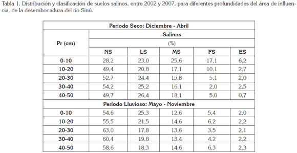 Agradecimientos: Al proyecto de investigación ''Diagnóstico general del nivel de salinización en la zona aledaña a la desembocadura del río Sinú y su impacto socioeconómico: Período Abril/2002 - noviembre/2008'' y al personal técnico del Laboratorio de Suelos y Aguas de la Facultad de Ciencias Agrícolas de la Universidad de Córdoba, Colombia. Conflicto de intereses: Los autores declaramos que no existe ningún conflicto de interés, que ponga en riesgo la validez de los resultados presentados.