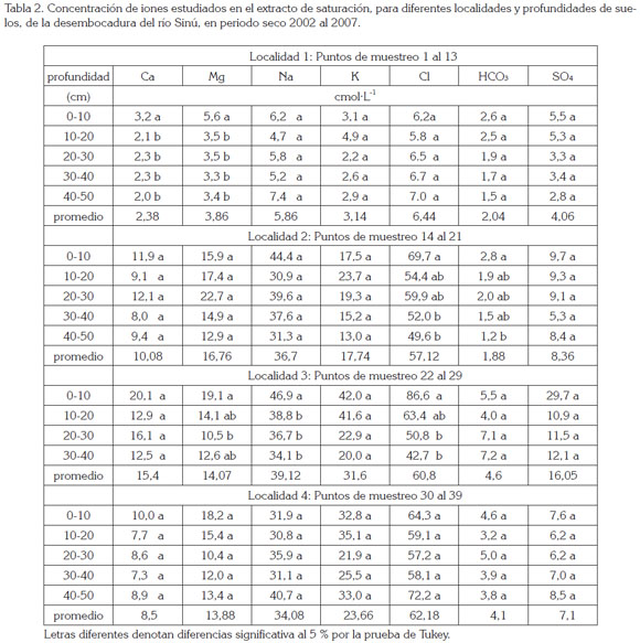Complementariamente, los datos de CE y de los iones en períodos secos y lluviosos para las diferentes profundidades, fueron sometidos a análisis de correlación simple (Pearson) y pruebas de separación de medias Tukey (5%), para los iones determinados en las diferentes profundidades, en las cuatro localidades, utilizando el programa estadístico SAS (Statistical Analysis System) v. 9.2.