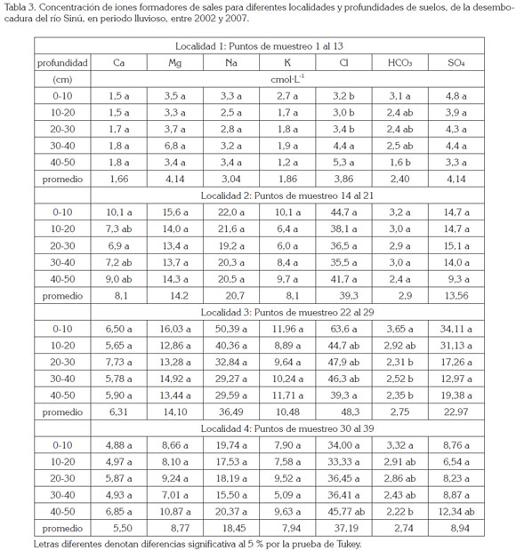 De igual forma, con excepción del SO4, los contenidos de los iones Na y Cl decrecen en el periodo lluvioso, condición que contribuye a la disminución de la salinidad de estos suelos (Tabla 4). La disminución de Na y Cl, se puede explicar por la disolución de estos iones con el incremento en los volúmenes de agua, en esta época, ya que la hidroeléctrica de Urrá I, entre febrero y marzo, aporta volúmenes de agua de 170,2 y 199 m3 s-1 y, en los meses de alta precipitación, octubre y noviembre, 464,9 y 361,3 m3 s-1.