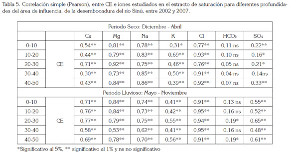 En la tabla 5, se indica la correlación de Pearson, entre los valores de conductividad eléctrica y las concentraciones de iones, determinados a cada profundidad, en periodos lluviosos y secos. Esta correlación, para las diferentes profundidades, en el periodo seco, indica que, con excepción del HCO3, los iones Cl, Na y Mg registraron correlaciones positivas y altamente significativas con la conductividad eléctrica, con r≥0,77**, r≥0,75** y r≥0,73**; sin embargo, la concentración de Na y Mg disminuyó en el periodo lluvioso y aumentó la concentración de los iones Cl, Ca y SO4.