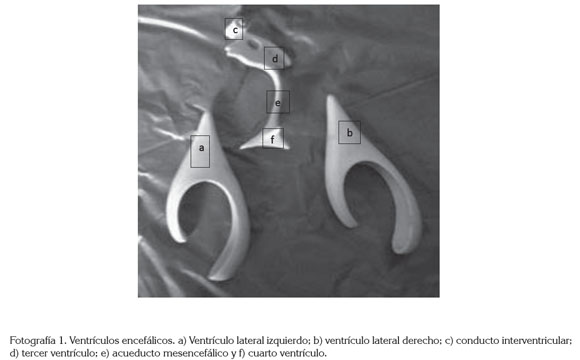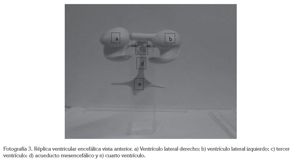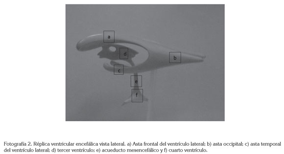 Por medio de la inyección y de la corrosión facilitadas en moldes de yeso, aplicando resina poliéster en encéfalos frescos, se generaron réplicas para el estudio del sistema ventricular encefálico humano; con este tipo de moldes, se logró una fidelidad prominente en tercera dimensión del sistema ventricular encefálico humano, con el mayor detalle en sus relieves anatómicos (Fotografía 1), lo cual, permite que la réplica sea una herramienta didáctica adecuada y costo efectiva, para el estudio del sistema ventricular, evitando los daños en los cerebros durante su manipulación, optimizando los ambientes de estudio en anfiteatros y aplicando un nuevo desarrollo investigativo y de docencia, puesto que facilita la medición de acueductos y de cavidades, como parámetros anatomopatológicos en enfermedades neurológicas relacionadas a la obstrucción o daño del sistema ventricular encefálico (Quijano et al. 2012; Barrientos et al. 2014).