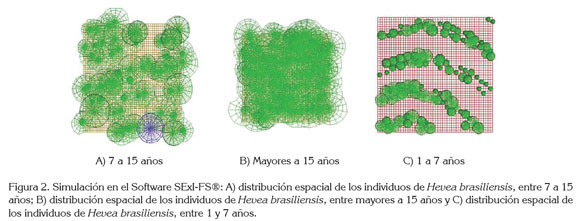 En la figura 2, se muestra la distribución espacial de los árboles de caucho en los arreglos agroforestales, así como la simulación de los individuos, a partir de variables biométricas, como altura total y de copa, diámetro a la altura del pecho, diámetro y área de copa. En general, se encontró una distribución irregular de los individuos en los arreglos agroforestales, entre los rangos de siete a 15 y mayores a 15 años de edad, lo que se traduce en una distribución de la radiación transmitida de una manera heterogénea; esta situación pude estar asociada con problemas en la planificación agroforestal, al no realizar actividades de resiembra y, por otra parte, el arreglo agroforestal de uno a siete años presenta una distribución homogénea de la radiación, que responde a un modelo de plantación regular (Figura 3).