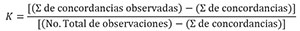 El grado de concordancia entre los resultados de la prueba microbiológica y los de ELISA, definidos con o sin presencia del residuo por tipo de muestra, se determinó mediante el coeficiente kappa (k), que se calculó según Landis & Koch (1977), utilizando la siguiente fórmula: