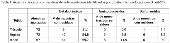 En el estudio, el hígado y el riñón mostraron similar comportamiento, en cuanto a la proporción de muestras detectadas con residuos de betalactámicos, estreptomicina y sulfametazina, por las dos pruebas.