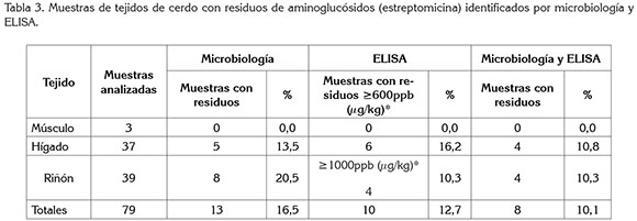 En tres muestras de riñón y tres de hígado, se detectaron, por las dos pruebas, residuos de dos antimicrobianos, betalactámicos y estreptomicina, mientras que una muestra de hígado fue positiva, únicamente, a residuos de estreptomicina, por microbiología y ELISA, según LMRs (Codex Alimentarius).