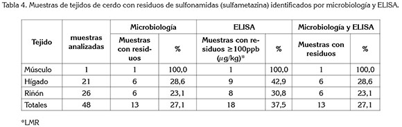 Para sulfonamidas, de las 48 muestras analizadas por microbiología y posteriormente por la prueba de ELISA para sulfametazina, cerca de una cuarta parte (27,1%) de las muestras concordaron por las dos pruebas, siendo identificadas como muestras con presencia de estos residuos, por encima del límite máximo. El hígado y el riñón fueron los tejidos identificados con mayor proporción de muestras con residuos del antimicrobiano, mientras que la única muestra de músculo, identificada con residuos de sulfonamidas, por la prueba microbiológica, fue identificada también con residuos de sulfametazina por ELISA (Tabla 4). Los hallazgos de residuos en riñón coinciden con lo reportado por Medina et al (2008), debido a que esta víscera concentra mayores cantidades de estos fármacos.