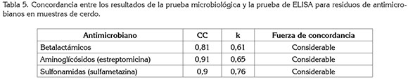 El análisis de concordancia, coeficiente de concordancia CC y coeficiente de concordancia k realizado entre los resultados de la prueba microbiológica y la prueba de ELISA, identificó una correspondencia considerable entre los resultados de las dos pruebas (Tabla 5). Para betalactámicos y estreptomicina, la prueba microbiológica y ELISA por separado identificaron más muestras positivas respecto a las muestras positivas corroboradas por las dos pruebas, lo cual, corresponde con un k menor, mientras que para sulfametazina, el k mayor correspondió con una mayor concordancia entre los resultados de las dos pruebas, para este antimicrobiano.